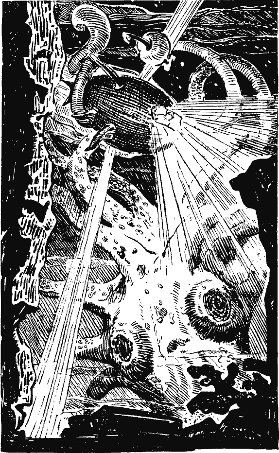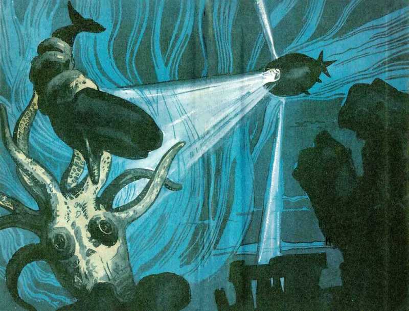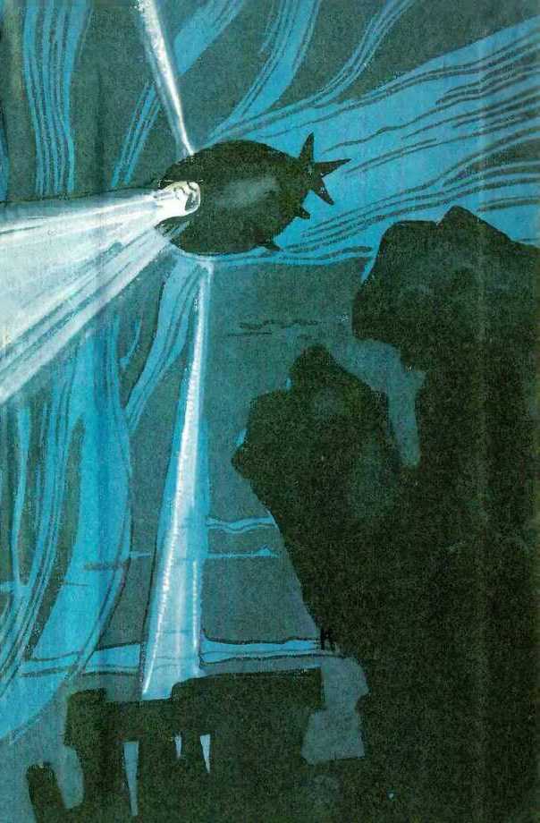 Чаури Сингх проворчал: — Долго он еще намерен любоваться нами? Я сказал, проникаясь нежностью к моллюску: — Жак спит. Не будем его будить. Пожалуйста, не надо. — Мне бы тоже сейчас не хотелось этого делать. Да он и не спит. Ему досталась очень небольшая доза снотворного, остальное унесло течением. Все же попытаемся высвободиться из его объятий, пока он находится в состоянии прострации. Я стал следить за смуглыми пальцами Чаури Сингха и экраном. Щупальца плотно прилипли к крышке «блюдца», приняв темно-зеленый цвет покрытия. Механические руки поднялись из гнезд, захватили клешнями щупальца, тщетно пытаясь оторвать их от металла. Лопнула кожа, голубую кровь моллюска уносила вода. Стальные клешни немного приподняли щупальца и сами оказались опутанными тройной спиралью. Я больно ударился лбом в стекло, раздался треск, и мы полетели куда-то с неимоверной скоростью, потом последовал новый толчок, треск и наступила тишина. «Блюдце» приняло горизонтальное положение. — Он оторвал нам «руки», — сказал Чаури Сингх. — Ты не находишь, что мы легко отделались, если ему не придет на ум повторить все сначала?.. Нет, мы идем. Он, наверное, «изучает» устройство механических рук. — Чаури Сингх засмеялся. Я долго сидел молча, чувствуя приятную слабость во всем теле, как после слишком горячей ванны. Мне стало вдруг смешно, и я с минуту давился от душившего меня смеха. С трудом мне удалось овладеть собой. Чаури Сингх сказал: — В следующий раз свидание с Жаком не произведет на тебя такого сильного впечатления. Надо сопротивляться его «воле». Знаю — трудно. Заставить себя быть сильнее. — Мне бы не хотелось с ним встретиться еще раз, — признался я, с тревогой посматривая на шкалу глубины. Тысяча пятьсот метров! Почти предельная для «Камбалы». Мы проплыли еще около километра в толще подводного течения и стали подниматься на поверхность. Чаури Сингх погасил прожекторы. «Камбалу» окружила абсолютная темнота. Скупой свет люминесцентной градуировки приборов только усиливал идеально черный цвет за стеклом. Мы молчали, зачарованные жуткой черной тишиной. Неожиданно мелькнул огонек, другой, проплыл пунктир огоньков, напоминающих иллюминаторы крейсерского батискафа. Вокруг него замелькали вспышки разноцветных петард. Чаури Сингх сказал: — Яркая окраска и здесь несет те же функции, что и в освещенной части биосферы. Это и стимулятор для сохранения вида, и ориентир для хищника, здесь все хищники. Свет — приманка, своеобразная наживка, как у удильщиков. Свет приносит и жизнь, и гибель. Но как красиво! Смотри! Какая фантазия понадобилась бы художнику, чтобы создать такую драгоценность! Под углом к нам двигалось живое ювелирное изделие из бриллиантов, рубинов, ярких изумрудов и еще множества каких-то незнакомых мне драгоценных камней. Они то затухали, то вспыхивали, переливались, будто их поворачивали перед невидимым источником света невидимые руки. Зажегся наш прожектор, и мы увидели отвратительное белесое создание, состоящее почти из одной пасти. У рыбы были большие глаза, но она совсем не реагировала на свет и медленно двигалась своим курсом. Прожектор погас, и опять засверкали драгоценные камни, расположенные с необыкновенным вкусом в сложном орнаменте. Чаури Сингх сказал в раздумье: — Какой обманчивой может быть красота! И, наверное, в понимании прекрасного ест