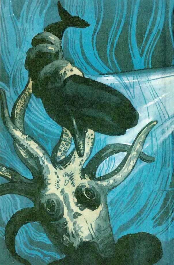 Великий Кальмар нежился на солнце, едва просвечивающем сквозь сероватую кисею облаков. Он принимал солнечные ванны, раскинувшись на воде. Его гигантское тело подчинялось движению волн, отливало пепельно-серыми тонами, под цвет неба и моря. Над Великим Кальмаром молча кружили морские птицы. Даже говорливые чайки притихли, будто прониклись почтением к чудовищу, выплывшему из мрака. — Кошмар, увеличенный в тысячу раз, — сказала Биата. Какое-то время наш «Пингвин» висел нал чудовищем, а затем Ки стал летать по кругу, безотчетно подчиняясь принятому здесь ритму движения. На это тогда никто не обратил внимания, всем казалось вполне естественным, что мы парим кругами. О Великом Кальмаре утром сообщили дельфины, ворвавшиеся в лагуну. Они бросили свой пост на крайних границах новых полей планктона и в панике примчались домой. За ними еще несколько отрядов прибыли на остров… — Он поднялся из тьмы, — сказал мне Тави. — Может быть большое несчастье. — Кто-нибудь его видел? — спросил я. — Тот, кто его увидит, больше не возвращается. Я спросил, как, по его мнению, долго Великий пробудет на поверхности и застанем ли мы его, если вылетим через десять минут. Тави от волнения перешел на ультразвуковой диапазон. В его глазах застыл ужас. Я стал его успокаивать, сказал, что мы летим на «Пингвине» и будем все время в воздухе, а Великий Кальмар силен только в своей стихии. Тави дрожал мелкой дрожью. Мне вдруг тоже стало не по себе. Я посоветовал Тави переждать опасность на «балконе» в обществе Хариты, и он с нескрываемой поспешностью кинулся из купальни, где мы с ним разговаривали, к ближайшему карнизу… Казалось, что огромные глаза Великого Кальмара пристально следят за нами. Биата зевнула. — Что это со мной? Я сегодня так хорошо спала, а глаза слипаются. Костя стал объяснять причину: — Надвигается циклон страшной силы. С ним не могут справиться метеоракеты. Давление катится вниз. Взгляни на барометр. Ну и экземпляр! Интересно, о чем он сейчас думает. И думает ли вообще, хотя Чаури Сингх, Лагранж и вот Ив уверены в его интеллектуальности. Представь, и у меня в голове туман. — Но почему такая тишина? — спросила Биата. — Перед штормом всегда очень тихо. — Ну нет, это особая тишина. Как там. — Где? — В бездне. Ты не был там и не представляешь, что такое тишина. Ты скажи мне, почему молчат чайки? Почему они летают по кругу? Почему мы тоже кружимся? И почему он так смотрит?.. Как хочется спать! Она положила голову Косте на плечо. Костя замер, боясь пошевелиться. Петя Самойлов сказал: — Действительно, очень низкое давление. Я еще не помню такого. Наверное, его величество поднимается на поверхность только при таком давлении и когда солнце прикрыто облаками. Костя зевнул: — Конечно, без привычки он сгорит на нашем солнце. Смотрите, потягивается во сне. Ну и скотина! Бр-р! — Да, он спит с открытыми глазами, — сказал Петя. — Ему необходима солнечная радиация, и вот он поднялся подремать в солярии. Биата покачала головой: — Что вы, что вы! Вы думаете, всем нужно солнце? Ах, как бы я хотела снова окунуться в черноту и спать, спать. Вы думаете, он спит? Загорает? Наивные люди! Он поднялся, чтобы полюбоваться на птичий хоровод. Нас он тоже принимает за птиц. Нет, за одну птицу. Или за птиц в птице. Почему мы так высоко летаем? Надо опуститься ниже. Ему будет приятно, когда мы будем ближе. Тогда м