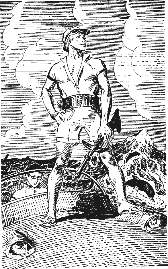 Сегодня «День великого ремонта». Проводится великий ремонт раз в месяц, шестнадцатого числа. Все население острова, кроме вахтенных, оставляет повседневные дела, осматривает и приводит в порядок «свой» участок. Литой базальт неимоверно прочен. Наверное, нужно не менее столетия, чтобы остров претерпел какие-то существенные изменения. Пока же солнце, вода и ветер наносят ему самые пустяковые повреждения. Иногда после шторма волны сорвут изоляционную обшивку с набережной, ливни смоют часть почвы и в наших садах и на плантациях. Ветер, атмосферная влага и морская соль постоянно не в ладах с антикоррозийными покрытиями ажурных башен. За сохранностью острова следит каждый из нас, и мелкий восстановительный ремонт ведется почти ежедневно. И все же за месяц накапливается масса недоделок, остаются участки, скрытые от глаз. Нам и достался один из таких симпатичных уголков нашего острова. В одной из глав я упоминал о канатах чудовищной толщины, которые удерживают плавающий остров на мертвых якорях. Вот нам и поручил Совет острова всячески опекать эти канаты, держать их в чистоте и сохранности. Я не могу себе представить, чтобы с ними могло что-нибудь случиться. Каждый из этих гибких столбов толщиной в полтора метра, кажется, один сможет удержать на месте остров, а таких канатов десять! Костя согласен со мной (редкий пример единодушия), он даже пожаловался Павлу Мефодьевичу на такое нерациональное использование творческих сил. На это наш наставник заметил: — Раз в год и кочерга стреляет. Костя наморщил лоб: — Кочерга? Как будто знакомый прибор? — Прибор довольно старый, служил для помешивания дров и углей в печах. — Ах, так. Что-то припоминаю. Где-то встречался с этим инструментом, — нашелся Костя. — И если он стреляет, то тогда… — Вот именно, не тратьте напрасно время и силы, а опускайтесь-ка, братцы, на дно. — Тоже афоризм? — спросил Костя. — Кульминационная часть одного забавного анекдота. После погружения в лагуну зайдите ко мне, и Прелесть расскажет его. Кстати, она знает их тысячи. Недавно она спрашивала, где эти два молодых человека с повышенным стремлением нарушать порядок и причинять неприятности окружающим существам. Какова плутовка? А?.. Под каменным днищем острова всегда царит вечный сумрак и постоянная температура 15 градусов. После двадцати пяти в верхних слоях здесь довольно холодно, пришлось надеть теплые комбинезоны с электроподогревом, а руки мерзнут: в перчатках трудно работать. Действуем по инструкции: вначале осматриваем крепления каната, соединяющие его с мертвым якорем. Сам якорь представлял из себя гигантскую полусферу из того же литого базальта. Ни полусферы, ни креплений не видно под зарослями водорослей и колониями разнообразнейших животных. Несмотря на значительную глубину, на дне кишит жизнь — небольшие полянки покрыли ярко окрашенные моллюски, морские черви, причудливые рачки ползают по стеблям водорослей, живые цветы — красавицы анемоны рдеют, шевеля своими предательскими тычинками-щупальцами. — И всю эту красоту мы должны превратить в ничто? — печально спросил Костя. — Потери будут небольшие: как только мы уйдем, они снова поселятся на старом месте, — ответил я. — Тебе легко говорить, а попробовал бы ты сам вернуться на прежнее место после того, как тебя подденут вот такой штукой!. — Он медленно приподня