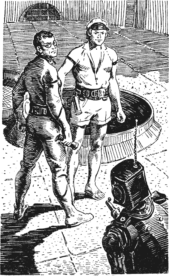Как всегда, несколько неожиданно окончилась тропическая ночь, запылало небо на востоке, и из воды выплыло солнце. С берега донесся птичий гомон. Дельфины приветствовали дневное светило своеобразным танцем: прошлись на хвостах вокруг «Мустанга» и умчались по своим делам. Мы с Костей занялись исследованием рощи кокосовых пальм. На опушке, в кустах и в глубине рощи мы обнаружили несколько «мертвых» роботов. Они лежали или стояли, у них давным-давно вышло питание и проржавели остовы. Их делали из стали низкого качества, видимо, надеясь на антикоррозийные покрытия, но эмаль не устояла против резких колебаний температур, высокой влажности и времени. Над головой проносились стаи разноцветных австралийских попугайчиков; они оглушительно щебетали, видимо протестуя против нашего вторжения. Попугаи гнездились в кронах пальм, на ветвях кустарника, несколько гнезд устроили на плечах и голове застывших роботов. Судя по инструментам, в руках роботов, они когда-то были садовниками, выпалывали кусты и траву между пальмами, а также следили за дорогами и дорожками. Сейчас дороги стали непроходимыми из-за колючих кустарников, пройти можно было только среди пальм. Пробираясь через заросли, вначале мы строили догадки о том, что говорила тетушка Лия, когда замолчал приемник. Что хотела сообщить нам Биата? И главное: кого ей хотелось увидеть, Костю или меня? Но постепенно, по мере того как мы продвигались в глубь рощи, все наши помыслы захватывал этот загадочный остров. Почему его оставили так внезапно? Об этом говорили мертвые роботы-садовники. Долгое время они еще расхаживали среди пальм, подстригая и выпалывая кусты, подметая дорожки. Бедный пожарник до сих пор несет службу. Мы вошли в дом посреди небольшого разросшегося сада. В нем сохранилась мебель, библиотека, в кухне работала электрическая плита, в холодильнике, тоже действовавшем, хранился большой запас продуктов. На стенах висели хорошие копии импрессионистов. Дом заняли попугаи; они сверкающим потоком хлынули через распахнутые настежь окна. — Люди почему-то бежали, — сказал Костя, когда мы оставили дом и пошли по дорожке, с которой еще не справились растения. — Что-то им угрожало. Бросили все и убежали. Единственный корабль погиб на рейде в этот трагический день. — А может быть, никто не спасся. — Нет, спаслись, — уверенно сказал Костя. — Нет следов нападения. Их предупредили, и они вовремя успели улететь. Дорожка привела на круглую площадь, вымощенную, как и причал, зелеными бетонными плитами. Среди общего запустения площадь поражала чистотой и порядком. Ее матовая поверхность тускло поблескивала, ни одного листа, сучка, ореха не видно было на ней. Как будто только что роботы-уборщики вымыли и подмели ее с необыкновенным усердием. На границе площади слегка поднимались над поверхностью непонятные громоздкие сооружения без окон, но с металлическими наглухо закрытыми дверями. И еще в центре площади обращали на себя внимание круглые люки с отброшенными крышками. Люков было четыре. Мы направились к ним, ступая, как по тонкому льду, оглядываясь по сторонам. Двери одного сооружения без окон отворились, и оттуда один за другим вышли два робота, они очень хорошо сохранились, совсем новые роботы, они катили перед собой тележки, издававшие шипение и свист. — Пылесосы! — сказал Костя. — Вышли на убор