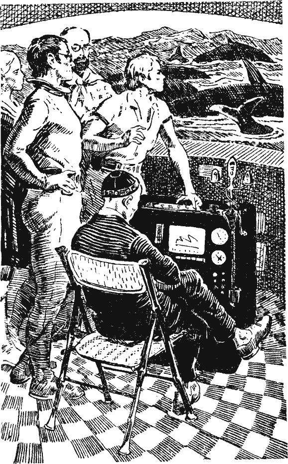 «Конура» оказалась огромной лабораторией, одну стену в ней занимал аквариум. За литым стеклом высотой около пяти и длиной не менее восьми метров застыла бирюзовая вода. В ее необычайной прозрачности кишела жизнь материковой отмели. Парили стайки рыб, одетые в разнообразные «праздничные» наряды, ветвились кусты кораллов, багряные, белые, розовые, зеленые, ярко-желтые, предательски прекрасные анемоны «цвели» на каменных глыбах, поднимались изящные ленты темно-зеленых, бурых и красных водорослей. На дне сновали крабы, рачки, лежали, раскрыв створки, перловины. Второй достопримечательностью лаборатории был светильник. Большая прозрачная чаша на бронзовой треноге. В чаше с водой застыл невзрачный кальмар-альбинос. Как видно, один из глубоководных видов. «Зачем он здесь?» — подумал я, заглядывая в чашу. Кальмар «ответил». Он вспыхнул изнутри голубым светом, а вся его поверхность покрылась разноцветными, тоже светящимися точками, расположенными с большим вкусом. При свете, источаемом кальмаром, можно было читать. Я никогда не видел таких кальмаров и подумал: «Вот бы послать Биате на спутник!» Как только я отошел от чаши, кальмар погас. Чаури Сингх, казалось, не обращал на меня никакого внимания. «Не уйти ли?» — подумал я и сразу отказался от этой мысли. Все в этой комнате притягивало: множество незнакомых приборов, кокетливый кальмар, грандиозный аквариум, на который можно было смотреть не отрываясь часами, но особенно интриговал сам хозяин. Высокий, худой, он сосредоточенно следил сразу за осциллографом и телеэкраном. На экране фиксировался кусочек океана, вернее, его дна, загроможденный черно-бурыми обломками базальта. Судя по темно-зеленому цвету воды, глубина была довольно значительной. Неожиданно я увидел осьминога. Он был необычайно велик. Я различал его смутные очертания и огромные фиолетово-черные глаза. Перед ним лежала груда двустворчатых моллюсков. Осциллограф чертил ровную, слегка волнистую линию. Я догадался, что каким-то непостижимым для меня образом Чаури Сингх умудряется наблюдать и записывать биотоки мозга этого моллюска. Чаури Сингх повернулся ко мне и спросил: — Тебе никогда не приходилось смотреть чужими глазами? Нет, конечно, не глазами другого человека, разница при этом была бы незначительна, а, например, глазами собаки, жука, курицы, рыбы, слона. Так вот, представь, что ты превратился в головоногого моллюска! — Он нажал желтый клавиш, и картина на экране телевизора мгновенно изменилась. Вода теперь казалась чем-то другим, абсолютно прозрачным, нежно-фиолетовым веществом. В нем плавали причудливо расплывшиеся громады скал, какие-то странные растения очень сложной пастельной расцветки. В фиолетовом мире двигались фантастические рыбы; и по форме, и по окраске они превосходили все, что мне приходилось видеть необыкновенного в глубине тропических морей. Картина неожиданно стала меняться. Цвета стали ярче, очертания скал, растительности, животных приобрели более знакомые формы. Коралловый куст вспыхнул алым пламенем, затем постепенно стал менять цвета, как остывающая сталь. Анемона, примостившаяся на коралловом кусте, так же поспешно меняла окраску своих «лепестков» и ножки, словно мгновенно переодевалась. Удивительные превращения происходили с чудовищно несуразной рыбой, будто раскрашенной художником-абст
