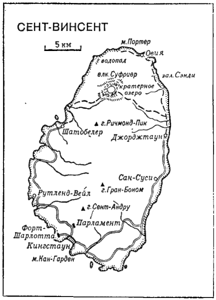 Сент-Винсент принадлежит к тем островам, где с удовольствием задерживаешься дольше, чем предполагал. На Сент-Винсенте ты можешь насладиться величественной природой, посмотреть исторические достопримечательности, встретить интересных людей или просто отдохнуть на сравнительно малопосещаемом туристами побережье. После Доминики это один из немногих островов на Малых Антилах, на котором в глубинных районах еще сохранились огромные нетронутые территории, где много эндемичных растений и животных. Кроме эндемичного попугая Amazona guildingii, относительно характерного для горных дождевых лесов, на острове есть, например, еще маленький лесной певчий Catharopeza bishopi, по-местному называемый «вислинг бёрд»[72]. Кроме того, на острове можно услышать (да и увидеть) многих вест-индских птиц, часть которых образовала особую географическую расу. Как и в других местах, здесь наиболее известны прекрасно поющий дрозд Myadestes genibardis, на Сент-Винсенте называемый птицей суфриер, а на островах с креоло-французским языком носящий поэтичное название «суфриер де монтань» (горный суфриер). На цветущих кустах и деревьях в лесах и садах можно часто увидеть три вида колибри, а если повезет, и их маленькие изящные гнезда. Самая маленькая колибри — Orthorhynchus cristatus, или the little doctor bird («маленькая птичка-доктор»), — не боится класть яйца даже среди вьющихся растений на открытых верандах. Однажды на Гренаде я видел подобное гнездо, висящее на электропроводке в гараже. Как и на других маленьких островах, кроме Мартиники и Сент-Люсии, здесь спокойно можно бродить по зарослям. Ни один из трех видов сент-винсентских змей не ядовит. Столь же малоопасны и ящерицы, шмыгающие по земле или лазающие по деревьям и кустам. Самый крупный вид их встречается в прибрежных кустах. Это зеленая игуана. На Мартинике и к северу от нее распространен вид Iguana delicatissima, а к югу от Мартиники — вид, называемый Iguana iguana iguana, который не становится от этого менее деликатесным. Некоторое время зоологи считали, что на Сент-Винсенте игуаны исчезли из-за появившейся здесь в XIX веке мангусты. Но я сам лично еще в 1961 году мог легко убедиться в недостоверности этих сведений. В тот год у Атлантического побережья я встретил охотника, поймавшего к обеду крупную игуану. Что касается низших животных, то интересно отметить, что Сент-Винсент — первое в мире место, где был обнаружен представитель древней группы животных — червеобразное членистоногое с когтями. Естествоиспытатель и священник Ландсдаун Гилдинг нашел это маленькое чудо под сгнившим стволом дерева в дождевом лесу. В 1825 году он опубликовал статью о своей находке в научном журнале, где описал странное существо как улитку без скорлупы, но с 35 «шишками» вдоль обеих сторон тельца. Позже в разных местах тропиков нашли сородичей этого Peripatus (так стали называть это животное). А сейчас известно, что «шишки» — это ноги и что речь идет о примитивном членистоногом животном, которое, говоря языком «Жизни животных», представляет собой «удивительную ветвь в той линии эволюции, которая привела к многоножкам и насекомым». Как известно, внутренняя часть Сент-Винсента в основном покрыта дождевым лесом. И в то же время, как это ни парадоксально, именно на этом британском Наветренном острове наиболее развито сельское хозяйство. Проезжая по шоссейным дорогам, ведущим от Кингстауна к