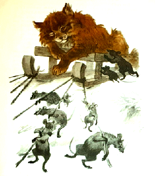 Кот и дрозд услыхали, бросились в погоню. Кот бежит, дрозд летит… Догнали лису — кот дерет, дрозд клюет, и отняли петушка.