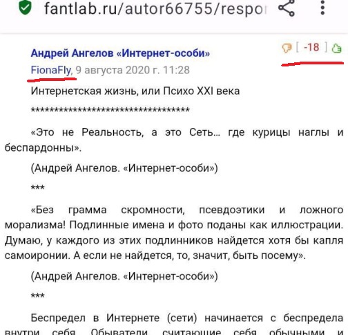 2. ФЛ забздел. Кинулся строчить жалобы в спец. ветке, мол, это клон Ангелова и так далее... надо эти рецы снести, а клона забанить. Мотив: Парфёнов М.С., его педофилы/сатанисты, их лизатели и сосатели — не хотели видеть на Фантлабе честные отзывы о творчестве Андрея Ангелова.