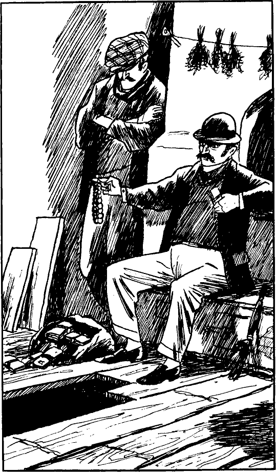 — Быстрее, — прошептал Оскар. — Бежим отсюда! Они выбежали в сени. Но было уже поздно. Голоса раздавались теперь у входных дверей. Путь им был отрезан. — Быстрее на чердак! Оскар пихнул Расмуса впереди себя на узенькую крутую лесенку, по которой мальчик так весело бегал днем. Теперь он спотыкался, как больной, и он в самом деле чувствовал себя больным, больным от страха. Ведь те двое уже распахнули дверь и вошли в темные сени. Оскар и Расмус остановились, замерли на лестнице. Они не смели шевельнуться, едва дышали, чтобы не выдать себя. Расмус со страхом уставился на две темные тени внизу, превратившие его жизнь в кошмар! Ах, как он ненавидел их! — Ты прав, не было никаких ящиков, когда мы были здесь в прошлый раз. Это был голос Лифа. Вот он рванул дверь в кухню. — И у тебя не хватило ума сообразить, что дело неладно, увидев, что сюда притопала целая фабрика ящиков, — зло заметил Лиандер. — Неужто тебе не ясно, что сами прийти сюда они не могли? — Да я только после об этом подумал, — ответил Лиф. — Знаешь ведь, как бывает, смотришь на какую-нибудь вещь и будто видишь ее и не видишь. И вдруг чуть погодя… бац! Тебе приходит в голову: «Откуда, черт возьми, взялись эти ящики?» — Видишь и не видишь! В нашей профессии такого позволить нельзя. Теперь придется забирать отсюда деньжата! «Ха! Деньжата уже отсюда перебрались», — подумал Расмус. Несмотря на страх, он ликовал. Но секунду спустя его ликованию пришел конец. Из кухни послышался яростный вопль, потом Лиф завопил: — Скорее! Бежим за ними! Они не могли уйти далеко! Они бросились в сени, свирепые, как разъяренные собаки, рванули дверь и стали искать неведомого врага, отнявшего у них добычу, чтобы найти его и разорвать на куски. На полпути к двери Лиф резко остановился. — Стой! — крикнул он. — Надо сначала поглядеть, не прячутся ли они в доме. Здесь, внизу, нет никого. Может, они на чердаке? Он побежал вверх по лестнице и наткнулся прямо на кулак Оскара, взвыл и рухнул вниз в объятия Лиандера. Расмус, стоя за широкой спиной Оскара, тоже взвыл. Он взвыл потому, что Лиандер направил на них револьвер и голосом, дрожащим от злости, сказал: — Сделай хоть один шаг, и я стреляю! Тут и Лиф успел подняться на ноги. Луч его фонарика осветил двоих на лестнице. Увидев «царя Соломона» во всем его великолепии, он ахнул: — Ожерелье у сопляка на шее! Грабители уставились на бродяг, не веря своим глазам. — Беги, Расмус! — крикнул Оскар. Он стоял, рослый, широкоплечий, загораживая узкую лестницу. — Беги! — рявкнул он громовым голосом. И Расмус побежал. Словно загнанная крыса, он юркнул вверх по лестнице на маленький ветхий чердак, где ветер раскачивал со скрипом пустые рамы. За окном была крыша пристройки. Он перемахнул через подоконник, прошел по крыше. Прыгать он умел. До земли было несколько метров, и он прыгнул. Он сейчас прыгнул бы даже с колокольни. Расмус слегка ушиб колени, но едва почувствовал это, ведь он был крысой, за которой гналась кошка. Он успел услышать, как Лиф подбежал к углу дома, готовый застрелить его, и побежал так, словно дело касалось жизни и смерти. Да так оно и было, он понимал это. Ах, все вы, уехавшие в далекую Миннесоту! Если бы знали вы, что случилось этой ночью в вашей серенькой деревушке у моря! Здесь бежит между избами испуганный мальчонка с изумрудами на шее, а за ним гонится грабитель. И некому помочь мальчишке