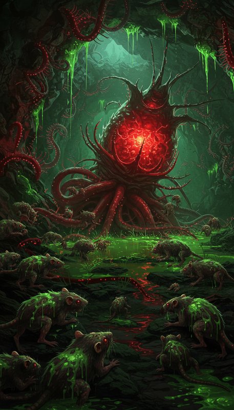 И вот мы вышли в длинный продолговатый грот. Не такой, как остальные громадные залы, которые я встречал на предыдущих точках испытаний. Всюду зелёная слизь и корни. На стенах, на потолках, на полу — сплошные лужи слизи, в которых барахтались и измазывались сотни зомби-крыс. Но это не главное. Самая мерзость — это огромное отвратительное растение, светящееся красным цветом прямо из центра. Бутон, из которого исходили сотни корней и источала слизь, выходящая из множества маленьких усиков. Растение слегка колыхалось и, как сердце, то сжималось, то разжималось.