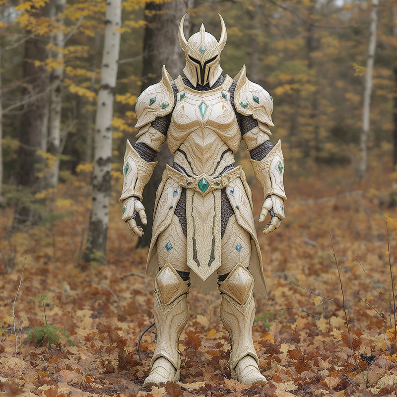 Этот доспех кажется вырезанным из светлой, почти белой древесины сакрального дерева. По его поверхности переливается сложный узор, похожий на годичные кольца, и мерцают вкраплениями похожие на изумруды спящие почки. Он источает слабый аромат цветущего сада и свежей хвои. Доспех находится в постоянном, едва заметном контакте с телом владельца через микрокорни. Он чувствует его состояние и реагирует на него. При усталости или истощении: Вы ощущаете прилив бодрости, словно выпили крепчайшего чая, как по внутренним капиллярам доспеха к вашим мышцам поступает тонизирующая влага «Утренней Росы», снимая усталость и истощение. При голоде или жажде: Вам больше не нужно носить с собой тяжелые фляги. Доспех медленно конденсирует из воздуха чистую, прохладную влагу, поступающую через специальный шип-тростинку, утоляя жажду. А в крайнем случае, он может впрыснуть под кожу густой, питательный «Нектар Корней», утоляющий голод на несколько часов. При ранении или отравлении: В ответ на проникающую рану, доспех мгновенно выделяет в место повреждения липкую, обеззараживающую «Смолу Жизни», которая замедляет кровотечение и блокирует инфекцию. Если в тело попал яд, доспех впрыскивает «Эликсир Чистого Листа» — мощный антидот, вырабатываемый из собственных резервов. Чтобы исцелить его раны, не нужны кузнецы — лишь возвращение к истокам. Его нужно воткнуть в землю, и он впитает в себя жизненные соки земли и восстановится. Неразделимый предмет. Необходимо облачаться в него только будучи полностью голым. На карте красовался красивый светлый древесный доспех, закрывающий всё тело. В местах стыков и отсутствия основной брони шло переплетение из волокон какого-то растения. Глухой шлем с Т-образным вырезом и двумя тонкими рожками. Сам доспех изобиловал мутными зелёными кристаллами. Не уверен, конечно, что он крепче стали, но и так неплохо, с учётом самовосстановления.