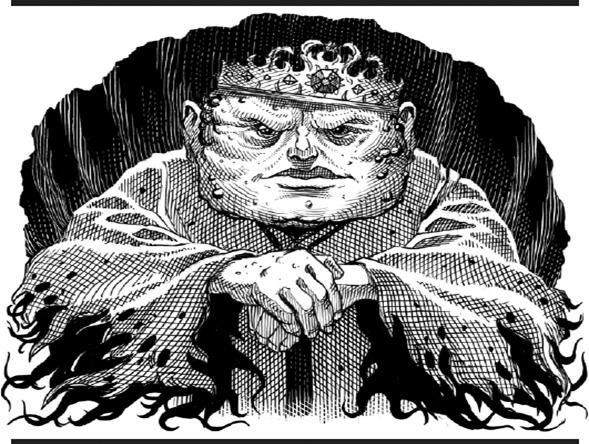 Недалеко от кухни коридор заканчивался высокой дверью, перекрещенной массивными железными полосами. На ней была надпись буквами высотой в три фута. Посмотрев на них прямо, я увидел слова: НЕ ВХОДИТЬ. Когда я повернулся, чтобы взглянуть на них боковым зрением, которого, к сожалению, не было у Кла, слова превратились в мешанину рунических символов… впрочем, я был уверен, что мои соратники могут их спокойно прочитать. Лия указала на меня. Я подошёл к двери и произнёс волшебные слова. С обратной стороны с грохотом отодвинулись засовы и дверь со скрипом открылась. — Надо было попробовать в Малин, — сказала Эрис. — Ты мог бы избавить нас от многих страданий. Я мог бы сказать, что мне не пришло в голову, и это было правдой, но не всей. — Тогда я не был принцем. Я всё ещё… — Всё ещё что? — спросила Джайя. «Всё ещё меняюсь, — подумал я. — Глубокая Малин была моим коконом». Я был избавлен от необходимости отвечать. Лия манила меня одной рукой, а другой тянула за то, что осталось от моей рубашки. Ну, конечно, она была права. Нам предстояло остановить апокалипсис. Коридор за дверью был намного шире и увешан гобеленами, изображающими всё, от костюмированных королевских свадеб и балов, до сцен охоты и пейзажей гор и озёр. Особенно запоминающимся было изображение парусного корабля, попавшего в клешни какого-то гигантского морского ракообразного. Мы прошли не меньше полумили, пока не приблизились к двойным дверям высотой в десять футов. На одной половине был баннер, изображающий старика, завёрнутого от шеи до пят в красную мантию. Корона на его голове была та же, что я видел на Летучем Убийце — ошибки быть не могло. На другой половине двери была изображена гораздо более молодая женщина, также с короной на светлых кудрях. — Король Джан и королева Кова, — сказала Джайя. Её голос звучал кротко и благоговейно. — У моей мамы была подушка с их лицами. Нам не разрешалось трогать её, только ложиться головой. Здесь мне не потребовалось произносить имя Лии; двери распахнулись внутрь по её прикосновению. Мы вышли на широкий балкон. Помещение внизу казалось необъятным, но трудно было сказать наверняка из-за кромешной темноты. Лия бочком двинулась влево, скользя в тени, пока почти не скрылась из виду. Я услышал слабый скрип, за которым последовал запах газа и низкое шипение из темноты над нами и вокруг нас. Затем, сначала по одной, потом по две-три, загорелись газовые лампы. Их, должно быть, насчитывалось больше сотни, освещавших огромную комнату. Ещё больше света давала люстра со множеством спиц. Я знаю, вы много раз прочитали «большой», «огромный» и «гигантский». Но лучше привыкните к этому, потому что всё именно таким и было… по крайней мере, пока мы не дойдём до кошмара клаустрофоба. Скоро я расскажу о нём. Лия покрутила маленький вентиль. Газовые лампы разгорелись ярче. Балкон на самом деле представлял собой галерею, вдоль которой стояли стулья с высокими спинками. Под нами находилась круглая комната с полом из ярко-красных плит. В центре, на чём-то вроде помоста, стояли два трона, один немного больше другого. Повсюду валялись стулья (гораздо мягче тех, что были на балконе) и маленькие диваны, похожие на места для влюблённых в кинотеатре. И там воняло. Запах был таким отвратительным и густым, что хоть топор вешай. Тут и там я видел кучи прогнившей еды, в которой копошились 