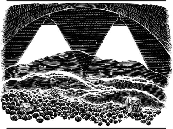 Мы пошли по одной из дорожек «вертушки», в этот раз вёл я. Задняя часть дворца нависала над нами, и опять я видел в нём живое существо. Возможно, дремлющее, но с одним открытым глазом. Я готов был поклясться, что некоторые бойницы переместились на новые места. То же самое можно было сказать и о пересекающихся лестницах и парапетах, которые на первый взгляд казались каменными, а в следующий миг — из тёмно-зелёного стекла с чёрными меняющимися фигурами. Мне вспомнилось стихотворение Эдгара Аллана По об одержимом духами дворце, из которого в вечном смехе, забывши улыбку, выбегала шумная толпа. Здесь остались инициалы мистера Боудича. Глядя на них, я словно встретил друга в неприветливом месте. Мы подошли к красным дверям погрузочно-разгрузочного отсека с пробкой из разбитых фургонов, затем к тёмно-зелёным парящим контрфорсам. Я повёл свою группу в обход, и хотя это заняло чуть больше времени, никто не возражал. — Стало больше голосов, — тихо произнёс Йота. — Слышите их? — Да, — сказал я. — Что это? Демоны? Мертвецы? — Я не думаю, что они могут навредить нам. Но без сомнения, здесь присутствует некая сила, и сила эта недобрая. Я посмотрел на Лию, которая сделала резкий круговой жест рукой: Поторопимся. Я понимал её. Мы не могли тратить впустую драгоценное дневное время, но я должен был показать ей. Она должна была увидеть, потому что лицезрение — это начало понимания. Или принятие давно отрицаемой правды.