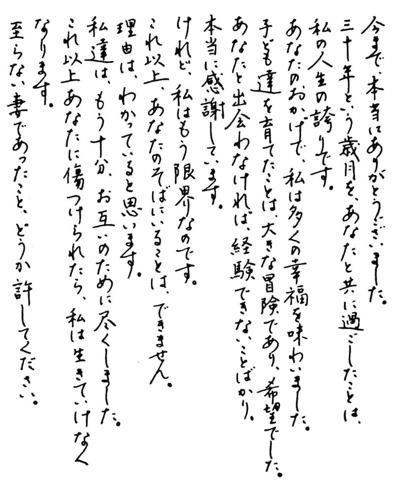 Спасибо тебе за все. Эти тридцать лет, прожитые с тобой, — гордость всей моей жизни. Благодаря тебе я познала немало счастья. Воспитание наших детей было грандиозным приключением с великими надеждами на будущее. Не встреть я тебя, ничего этого я бы не испытала. Да хранят тебя небеса. Но при всей благодарности я должна сообщить тебе, что терпение мое на пределе. Я не могу больше оставаться с тобой. Думаю, ты знаешь почему. Мы уже дали друг друг все, что смогли. Но если ты продолжишь причинять мне боль, моя жизнь станет слишком невыносимой. Знаю, что и сама я не была идеальной женой. Прости меня за это, если сможешь. Если честно, после этих тридцати лет я не уверена, смогу ли нормально жить без тебя рядом. Но расстаться нам все же придется — и ради меня, и ради тебя самого. Возможно, это известие застанет тебя врасплох. Но я давно уже обдумывала такую возможность, спокойно и рассудительно. И теперь понимаю: время пришло. Наши маршруты расходятся, и дальше пусть каждый шагает своей дорогой. Возможно, однажды, когда мы оба состаримся, мы еще встретимся как добрые друзья и с улыбкой поболтаем за чашкой чая. Заявление о разводе прилагаю здесь же. Со своей стороны я все заполнила и подписала, тебе нужно сделать то же самое и отнести бумагу в мэрию. Заранее спасибо.
