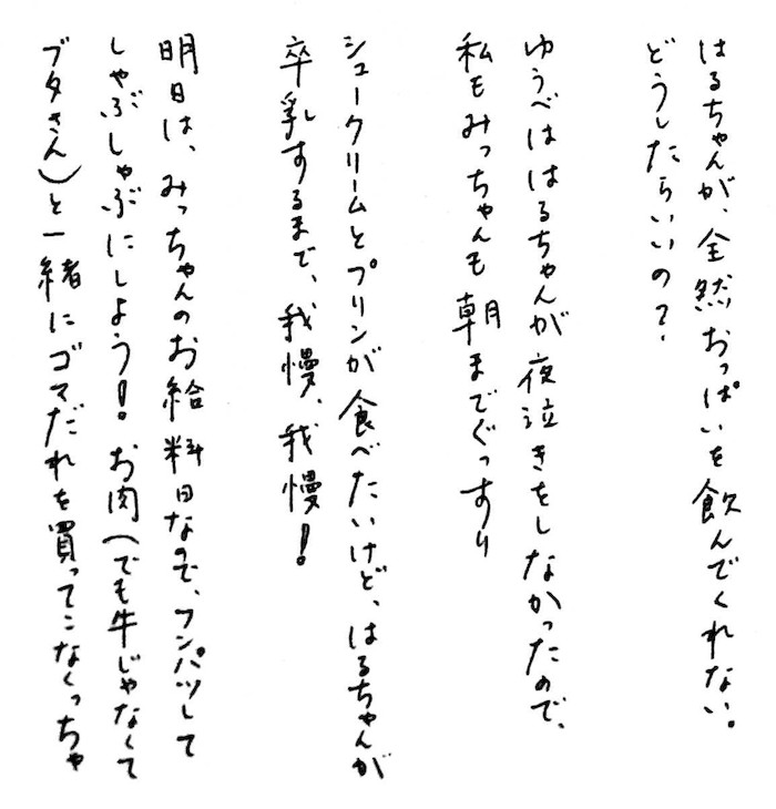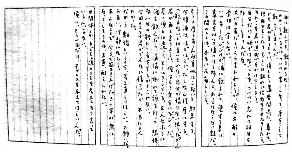 Прости меня, Ёко. Прости, что был тебе таким позорным мужем. Ужасно сожалею о том, что все закончилось именно так. Знаю, сколько тут ни извиняйся — прощения мне не светит. Но сожалею все равно. Ни хорошим мужем, ни достойным отцом я стать не сумел. Я полное ничтожество. И отчетливо это осознаю. За что и наказан. Умоляю тебя: постарайся выйти замуж снова, даже если это случится не сразу. И тогда наконец-то будь счастлива в браке. Молюсь, чтобы ты встретила достойного спутника жизни — полную противоположность мне. И чтобы однажды вы с сыном смогли улыбаться, даже ругая меня на чем свет стоит. Проклинайте меня от души, не сдерживайтесь! В заключение я хотел бы сказать спасибо. Я очень благодарен тебе за все. Прости, что усложнил тебе жизнь.
