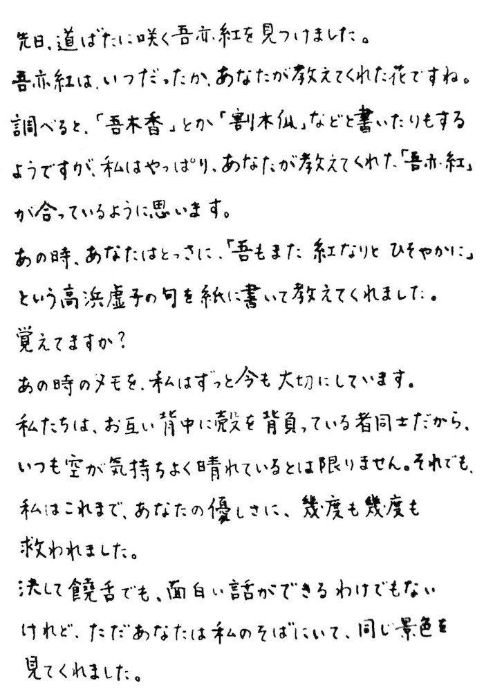 На следующее утро я обнаружила в почтовом ящике конверт без марки. Как обычно по понедельникам, я прибралась в доме, а затем подмела листья вокруг фумидзуки и уже меняла воду в чашке на полочке для подношений, когда взгляд мой, скользнув по почтовому ящику на воротах, заметил что-то внутри. Как я и думала, это было письмо от Кюпи-тян. В начале знакомства мы с Кюпи-тян переписывались очень бурно, однако в последние пол года не обменялись уже ни строчкой… В нетерпении я вскрыла конверт, не отходя от ворот. Аккуратно отлепила наклейку с зайчиком, и мне на ладонь выскользнула самодельная открытка.