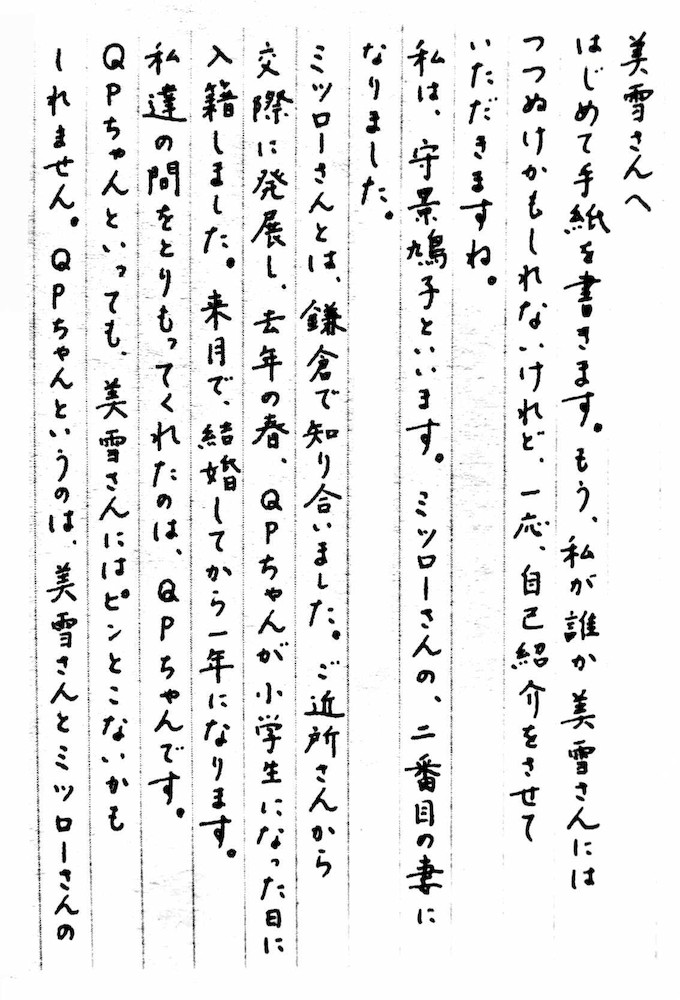 Дорогая Миюки-сан! Пишу Вам впервые. Наверное, Вы уже знаете, кто я. Но все равно позвольте представиться. Зовут меня Хатоко Морикагэ. Я новая жена Мицуро. Познакомились мы в Камакуре. Сперва были просто соседями, но со временем стали парой и прошлой весной поженились. В день, когда Кюпи-тян пошла в первый класс. Через месяц нашей новой семье исполнится ровно год. А свела нас вместе именно Кюпи-тян. Возможно, Вам это прозвище ничего не говорит, но Кюпи-тян — это ваша с Мицуро дочь. А называть ее так я решила сама. От всего сердца благодарю Вас за то, что Вы родили ее на свет. И пишу прежде всего затем, чтобы сообщить Вам об этом. Ваша дочь в корне изменила меня. Направила меня в мир добра и света. И теперь я уже не могу представить свою жизнь без нее. Но чем больше я благодарю Вас, тем глубже ощущаю перед Вами свою вину, представляя, как Вы страдали и какой ужас пережили перед тем, как оставить наш мир. Не сомневаюсь, что, даже истекая кровью, в последние минуты Вашей жизни Вы думали о своей дочери. Кланяюсь Вам, как матери, до самой земли. Когда я впервые увидела строки, написанные Вашей рукой, мне вдруг показалось, будто я знаю Вас уже очень давно. Я сразу поняла, что очень люблю Вас, и горько пожалела о том, что не могу с Вами ни встретиться, ни подружиться. Какое это было бы удовольствие ― общаться с Вами за чашкой чая и путешествовать вдвоем по белу свету! Почему-то я уверена, что мы с Вами стали бы отличными подругами. Ведь, что ни говори, а у нас даже одинаковый вкус на мужчин! И раз мы обе считаем Мицуро красавцем, значит, смотрим на мир под однимуглом… Могу ли я надеяться, что Вы позволите мне называть Вашу дочь, вслед за Вами, ее настоящим именем, Хару-тян? До сих пор я боялась, что поступать так — все равно что выгнать Вас из Вашей собственной семьи, и сама эта мысль очень угнетала меня. Но я очень хотела бы стать ее матерью навсегда. Недавно, ухаживая за Кюпи-тян в часы ее недуга, я поняла это окончательно. И теперь я молю Вас об этом — в робкой надежде, что Вы отнесетесь к моей мольбе благосклонно. Я сделаю все возможное, чтобы семья Морикагэ стала самой прекрасной республикой счастья во всей вселенной. Страной, которую я буду защищать всю оставшуюся жизнь. В которой Вам всегда найдется самое достойное и почетное место. Клянусь. Возможно, это всего лишь мечта, но, если бы Вы смогли вернуться к нам в виде нашего с Мицуро ребенка, я приняла бы Вас с распахнутым сердцем и распростертыми объятиями. И если я однажды забеременею, позволите ли Вы мне рожать ребенка с подобной молитвой в моей душе? Будьте уверены: Ваши пожелания всегда будут направлять меня и впредь. Спасибо Вам еще раз за Хару-тян. Я люблю Вас, Миюки-сан. И буду любить всегда. Хатоко