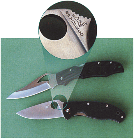 Клинки, изготовленные для SPYDERCO в Китае и из китайской стали 8Cr13MoV. Сверху Lightweight Сага Сага, представитель линии Byrd, разработанной в SPYDERCO, изделия которой SPYDECO контролирует по вопросам качества, чтобы не стыдно было продавать в Европе и Америке рядом со своими фирменными изделиями. Внизу Tenacious, предлагаемый уже в основной линии SPYDERCO, хоть изготовленный из той же самой стали тем же самым Китайским предприятием в рамках той же самой международной кооперации. Конечно, SPYDERCO, продавая эти ножи принимает на себя все и всяческие гарантийные обязательства, с ними связанные. Таких ножей китайского производства нечего бояться, особенно если Вам нужен нож именно для работы, а не для хвастовства.