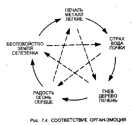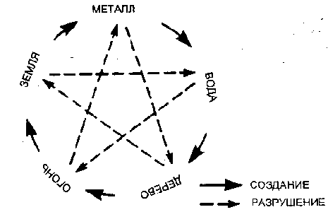 Одна из китайских поговорок говорит, что эмоциональные болезни лучше всего лечить эмоциями. Так как большинство психических заболеваний вызвано отрицательными эмоциями, то китайские врачи на протяжении веков для лечения психических болезней пользовались исключительно методом противопоставления одной эмоции другой. Были записаны многочисленные интересные истории таких случаев, одну из которых я поведаю читателям. Ли Сиань Да очень хорошо сдал экзамен при поступлении на имперскую гражданскую службу, и император пригласил его в столицу на должность заместителя министра. Отец счастливца перевозбудился. По нескольку раз в день его раздирал беспричинный смех, потом он стал смеяться беспрерывно, еще позже за смехом последовала истерика. Ни один врач не мог его вылечить. Ли решил подать в отставку и уехать домой. Когда император услышал об этом, он повелел своему личному врачу вылечить отца Ли. “Ваше величество — сказал врач, — никакое лекарство не может вылечить старшего Ли от такой необычной болезни”. Услышав слова врача, Ли Сиань Да стал терять самообладание. “Но вылечить его все-таки можно, — добавил врач. — Я " уверен, что смогу вылечить болезнь, если его величество позволит мне сыграть небольшую шутку”. Несколько дней спустя отряд солдат окружил дом старшего Ли и арестовал всю семью. Генерал, прибывший специально по этому делу из столицы, сердито кричал на него: “Вы и Ли Сиань Да организовали заговор против императора! Я прибыл сюда, чтобы казнить вас и всю семью”. Ли очень испугался. Первый день в заключении он молчал и дрожал от страха. На второй день от стал выть и причитать. На третий день к нему вернулись чувства, и он смог выкрикнуть, что он и его сын невиновны. Тогда генерал отпустил его вместе с семьей и сказал, что это была всего лишь шутка, предложенная врачом императора, чтобы вылечить эту странную болезнь. Врач императора применил принцип “вода разрушает огонь” для избавления человека от истерического смеха. Чтобы понять принцип и то, как китайские врачи используют эмоции для лечения душевных болезней, давайте рассмотрим концепцию пяти элементарных процессов.ПЯТЬ ЭЛЕМЕНТАРНЫХ ПРОЦЕССОВ