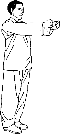 Цигун — искусство прикладное, а не чисто академическое. Практика необходима. Следующее упражнение является одним из лучших в цигун — оно полезно как для начинающего, так и для мастера. Причем допустимы некоторые отклонения в технике выполнения, даже небольшие ошибки. Форма в цигун не является самоцелью, ее задача — создать поток энергии внутри тела. Однако чрезвычайно важно плавно дышать. Обычно начинающие стараются дышать как можно глубже. Они думают, что чем глубже вдох, тем больше прибудет силы. Это неверно. На занятиях цигун вдыхается не просто воздух, а космическая энергия. Усилия при вдохе часто препятствуют потоку космической энергии. Еще одним необходимым условием является способность к расслаблению. Делая упражнение, освободите ваше сознание от неприятных мыслей. Указанные три момента являются фундаментальными для всей практики цигун. Однако для начинающего, совершенно незнакомого с цигун, даже они могут оказаться трудны. Не расстраивайтесь. В течение некоторого времени просто попытайтесь выполнять упражнение без всякого напряжения. Встаньте прямо, расслабьте мышцы, ноги поставьте вместе. Руки опустите вниз. Поверните кисти рук пальцами навстречу так, чтобы между кистями и предплечьями был прямой угол. Ладони направьте к земле и держите их перед собой (рис. 1.1).