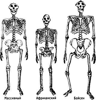 Приспосабливаясь к питанию грубой растительной пищей, часть потомков Люси 2,8 млн лет назад дала начало новому виду, более мощному, с укороченными клыками, — африканскому австралопитеку. От него 2,3 млн лет назад — еще один вид. Все эти австралопитеки «решали» свои эволюционные задачи «силовым методом»: зубы у них были крупные, челюсти мощные, могучая жевательная мускулатура прикреплялась к крепкому гребню на черепе. Сами они были очень большими, так что хищникам с ними было справиться непросто. Каменных орудий они не употребляли. Мозг их за 2 млн лет не увеличился. Словом, жили по принципу: «сила есть — ума не надо». Они обитали в Африке рядом с предками человека, но нашими предками они не являлись. Это наши двоюродные родственники, вымершие около миллиона лет назад.
