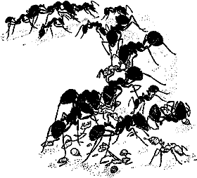 На следующем рисунке — применение оружия при набеге на чужое гнездо амазонками (светлые). Амазонки — рабовладельцы, и рабов выращивают из куколок бурых лесных муравьев (на рисунке они черные). Чтобы добыть куколок, амазонки совершили набег на гнездо бурых муравьев и разбили их в беспощадном бою. Они уносят бочковидных куколок к себе в муравейник.