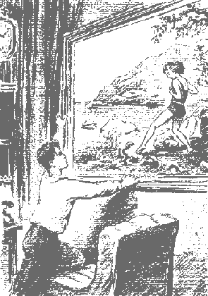 Набравшись храбрости, Алеша постучал по песку у ее ног, но девушка, не замечая его, неожиданно начала раздеваться. Алеша отвернулся, а когда он минуту спустя вновь взглянул на картину, девушка оказалась в купальном костюме, черном с белым поясом. «Интересно, — подумал Алеша, — неужели художник так и писал ее снизу — обнаженную натуру, по ней купальный костюм, на нем — платье, а сверху — белый плащ с капюшоном?» Девушка отстегнула маленькие часики (художник не забыл и часики) и вдруг, обернувшись к Алеше, помахала ему рукой.