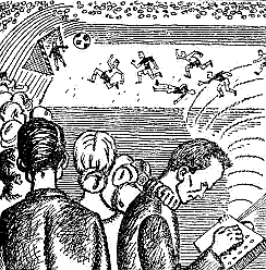 Матч епохи До фіналу “Добрі вовки” й “Бородаті хлопчики” прийшли, як кажіть, голобля до голоблі. Вони мали не тільки однакову кількість очок, але й — досить рідкісний у футбольній практиці випадок — однакове співвідношення забитих і пропущених м’ячів. Від завтрашньої зустрічі залежало все. Переможці здобували платинові медалі, лаврові вінки (одинадцять таких вінків привіз учора до столиці спеціальний літак). На чемпіонів чекав двадцятихвилиннчй прийом у президента і слава національних героїв. Від самого раннього ранку групами й поодинці на стадіон посунули глядачі. Виразно жестикулюючи, уболівальники обговорювали шанси тієї й тієї команди. Газети запевняли, що на фінальний матч уболівальники з’їхались і злетілися буквально з усієї планети. Можливо, газети, як завше, дещо перебільшували. В усякому разі, люду й справді було багато. Новий стадіон на двісті п’ятдесят тисяч чоловік не міг вмістити і п’ятої частини всіх охочих попасти на це цікаве видовисько. Можна було, звісна річ, стежити за ходом боротьби й дома, біля екрана телевізора. Але це, як відомо, далеко не те. Кортіло подивитися зблизька справжнє спортивне змагання майстрів найвищого класу. Роботи-поліцаї, допомагаючи собі замашними гумовими кийками, підтримували порядок на вулицях, що прилягали до стадіону. Ідоли в формених мундирах походжали тротуарами, байдуже годуючи духопеликами всіх, хто, як їм здавалося, порушив порядок. Ті уболівальники, що підігріли себе віскі чи джином, намагались триматися від ідолів подалі. З власного досвіду вони знали: роботи-поліцаї куди гірші й нещадніші за звичайних охоронців порядку, хоч і ті були далеко не ангели. “Матч епохи” супроводжувався нечуваним ажіотажем у ділових сферах. Річ у тім, що за спиною кожної команди стояли могутні угрупування трестів і монополій. Вони билися об заклад, ставлячи і на “Добрих вовків” і на “Бородатих хлопчиків” величезні суми. За висловом одного із спортивних коментаторів, “гроші, кинуті на бочку, могли б скласти купу, котра своєю вершиною сягнула б Місяця”. На “Бородатих хлопчиків” ставила, зокрема, всемогутня “Уестерн компані”, що її не без підстав вважали за державу в державі. Сотні електронних машин невтомно лічили й перелічували всі можливі варіанти гри. При цьому на шальку уявних терезів кидали, здавалося б, найдрібніші факти, скажімо, те, що центр нападу “бородатих” юнацькі роки прожив у дядини на Атлантичному узбережжі, а центр захисту команди “вовків” в дитинстві хворів на свинку… Та ось врешті настала урочиста хвилина. Всі, кому поталанило дістати квитка чи прошмигнути на стадіон “зайцями”, сяк-так розташувалися на трибунах. На поле, обнесене колючим дротом та ровом із водою, жваво вибігли гравці обох команд. Груди й спину кожного “вовка” прикрашало зображення вишкіреної пащі звіра, котрий дав назву команді. “Бородаті хлопчики” були у своїй традиційній білосніжній формі. Суддя, сидячи в броньованому маніпуляторі, позирнув на секундомір, і над завмерлим стадіоном срібно засюрчав свисток… “Вовки” зразу ж кинулися в атаку. Вони штурмували розгорнутим фронтом. Особливо небезпечним здавався форвард “вовків”, новоявлена двадцятилітня зірка. Він з однаковим успіхом бив і лівою і правою, а фінтив так, що всі, хто уболівав за “Добрих вовків”, тільки кректали блаженно та зах