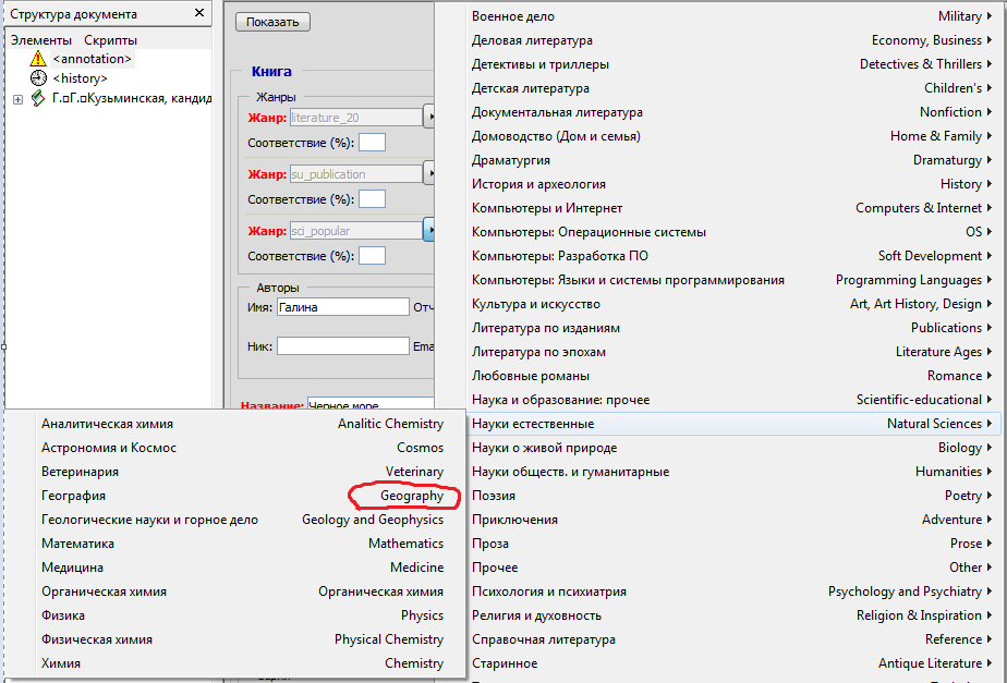 Переустановил заново FBE v2.6.9 с очисткой временных файлов; заменил файлы в программе из архива для (FBE с v2.6.8 по v2.7 beta 1). Появилась таки опция "География и другие науки о Земле (Geography)". В меню же FBE "Сервис"->"Настройки" выберите "Другое"->"Жанры в формате CoolLib" отсутствуют. Короче: мама его знает... как должно быть на самом деле; почему у меня просто (Geography) вместо (sci_geography).